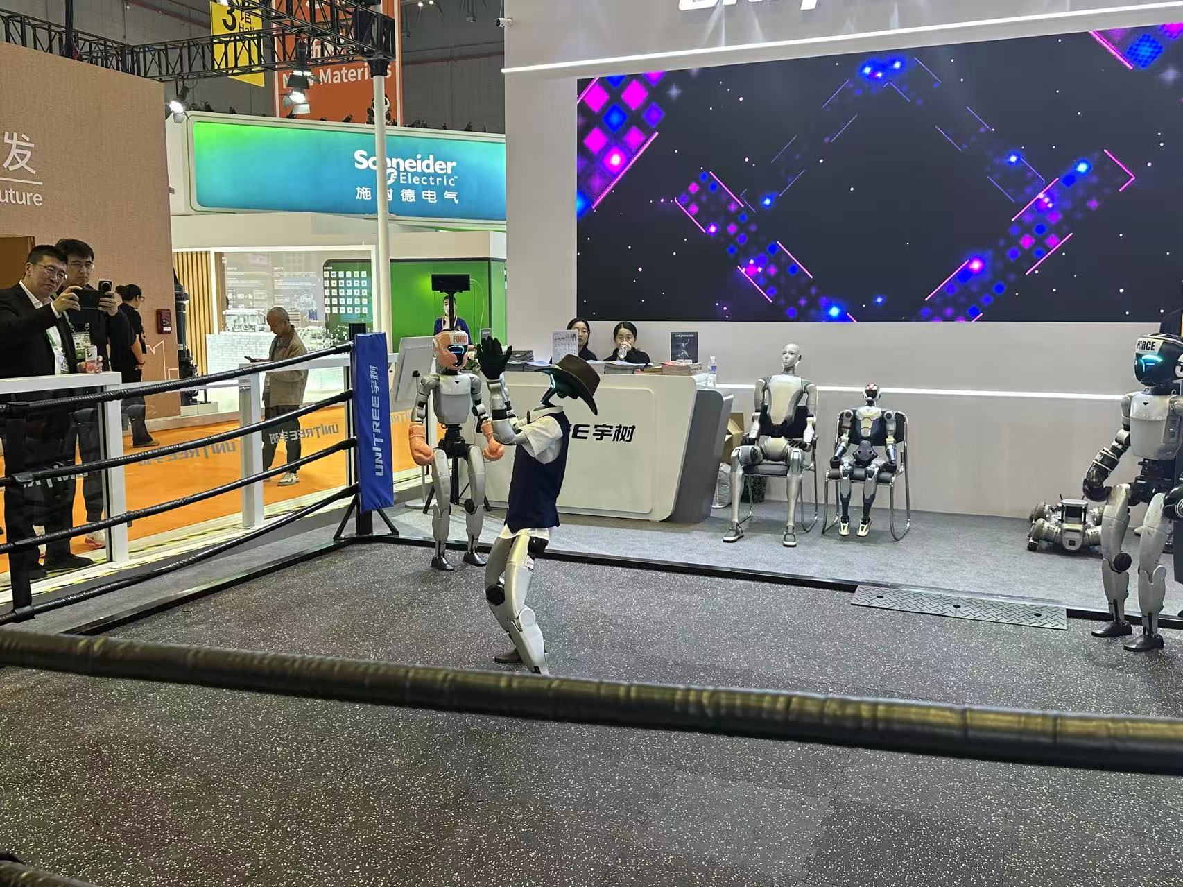 在宇树科技展台,人形机器人的舞蹈和格斗表演吸引了众多观众。
